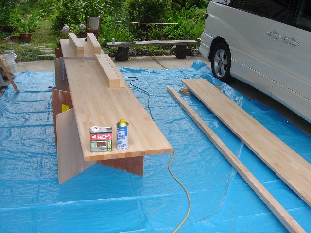 まず、材料コレ。なじみの建材屋たたいてカウンター材1枚5000円。ホームセンターで買うと30000円くらいやと思う。それ2枚。あと足の材料と、塗料。コレだけ。総額2万ほど。